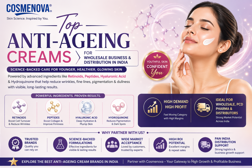 Top Anti-Ageing Creams for Wholesale Business and Distribution in India – Many factors, such as increasing awareness about skincare, early aging and dermatological treatment, the demand for high-quality anti-ageing concerns, and dermatological treatments. Top ingredients such as retinoids, peptides, hyaluronic acid, and skin-lightening agents like hydroquinone are the real game changers when it comes to anti-ageing formulations. These ingredients help in treating wrinkles, fine lines, pigmentations and dullness.